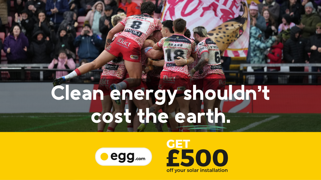 £500 savings on solar for Leopards fans! ☀️ Trusted to power homes and businesses with clean energy for more than ten years, egg is empowering people to make better, greener choices with solar panel, battery storage, and electric vehicle charging solutions. egg is proud to sponsor Leigh Leopards, supporting the team both on and off