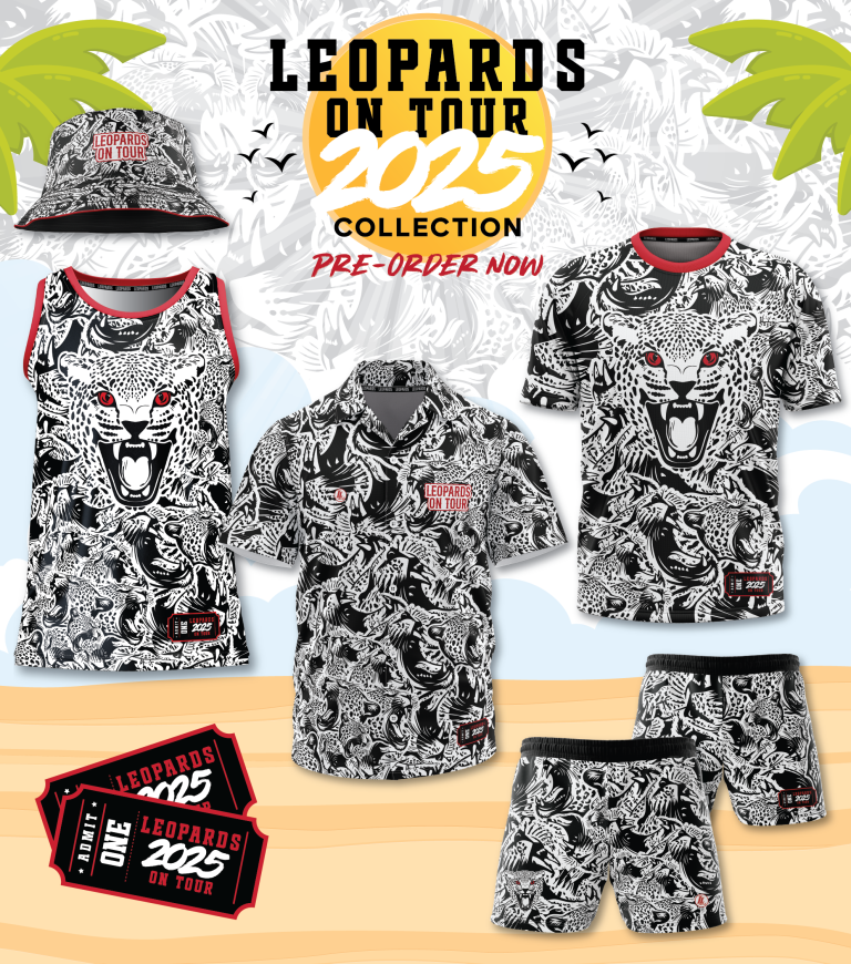 Featuring striking shirts, shorts, vests, and bucket hats, this exclusive range is packed with Leopard pride and finished with the official ‘Admits One – Leopards On Tour 2025’ ticket – your pass to exclusive Leopards events whilst in Perpignan.