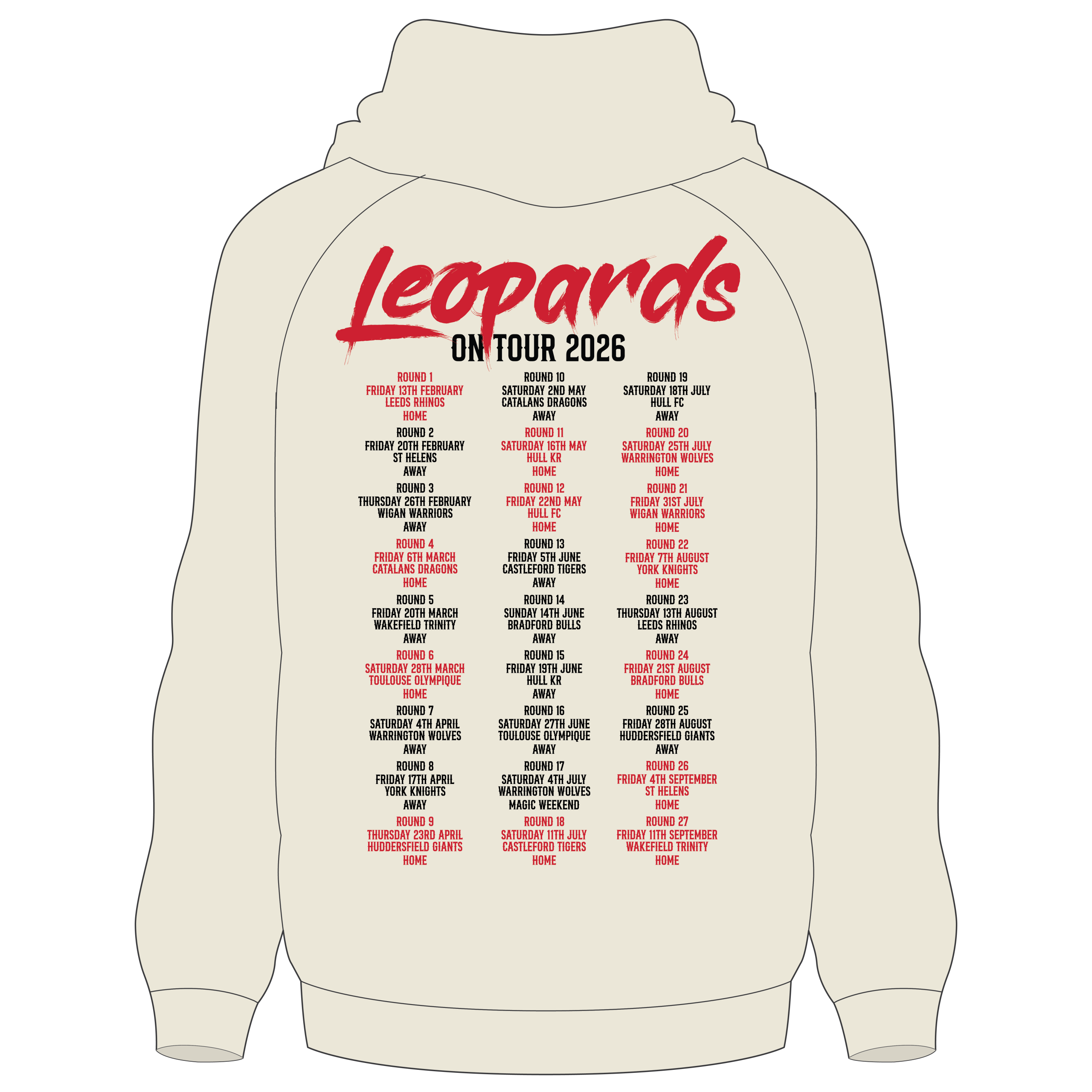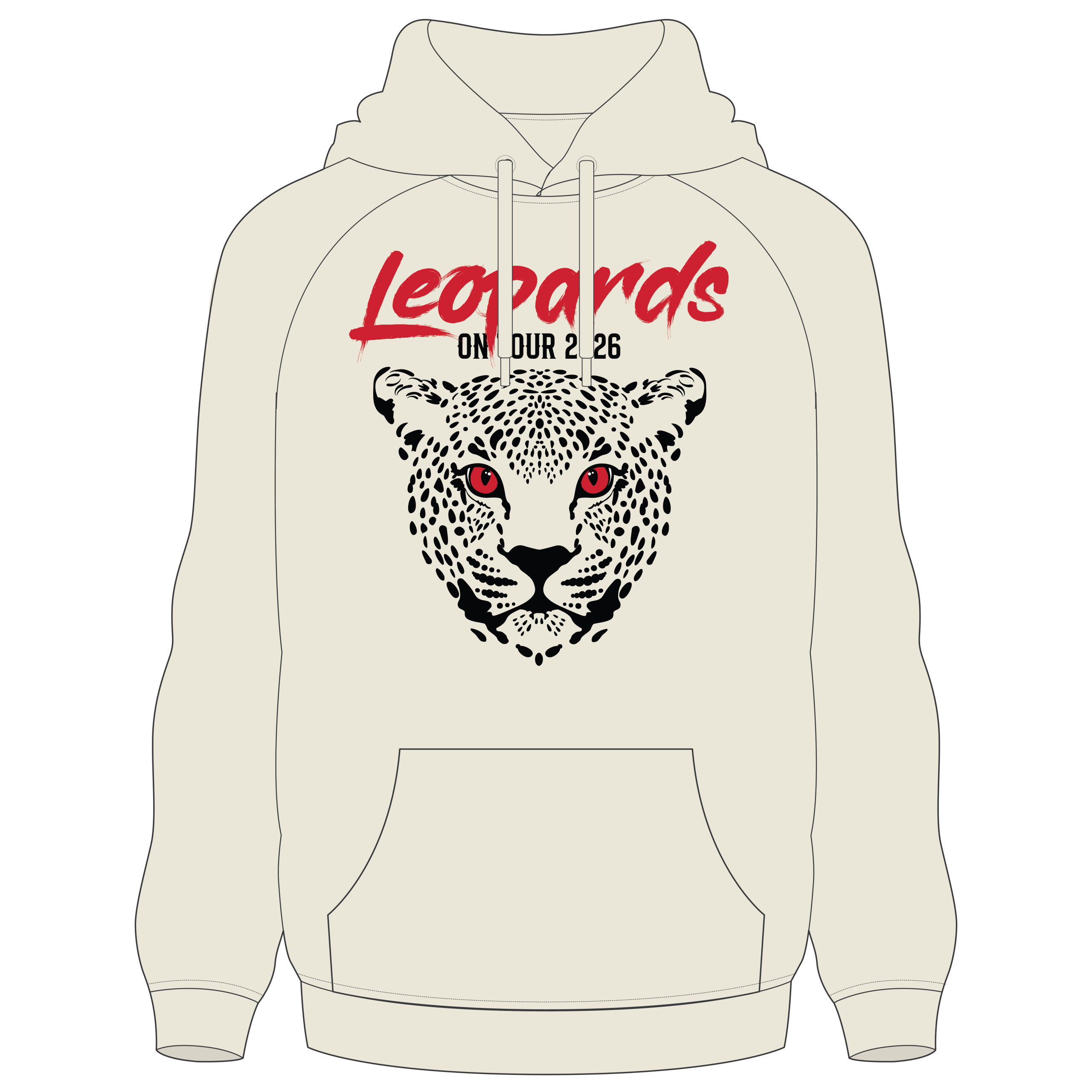 Featuring a clean sand colourway, this hoodie is finished with a bold Leopards graphic on the front, complete with striking red eye detailing and “Leopards On Tour 2026” branding. The back showcases a detailed tour print with fixtures and locations, making it the perfect keepsake for fans following the journey.