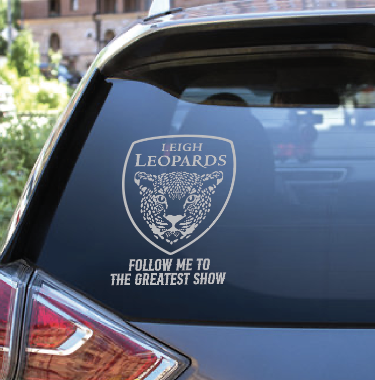 Featuring the official Leigh Leopards crest and the slogan “Follow Me to The Greatest Show”, this striking silver print on clear material adds a sleek, professional look to any vehicle or window.